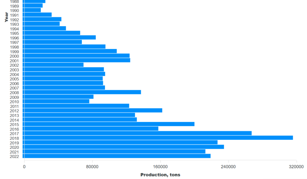 Tanzania is one of the largest exporters of cashew nuts globally. In the 2023, the country exported 222,389 metric tons of cashew nuts, valued at around $220 million down from 330,622 metric tons valued at around $542 million in 2017. Cashew nuts are a significant agricultural export for Tanzania, contributing substantially to the country’s economy and agricultural sector.